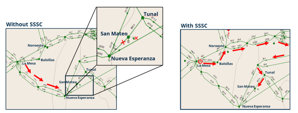 Assim, a instalação de equipamentos FACTS no anel superior da linha San Mateo – Nueva Esperanza permitiu redirecionar fluxos de potência e postergar a necessidade de duplicação de linhas de transmissão convencionais.