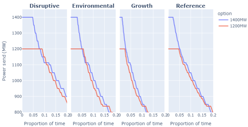 Curvas de duração de fluxo para transferências HVDC em 2055 comparando a Opção 2 (1.200 MW) e a Opção 3 (1.400 MW) (Fonte: Relatório de modelagem de benefícios do HVDC MCP)