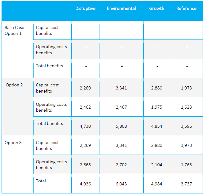Valor presente dos benefícios brutos de mercado em relação ao Caso Base (Opção 1) – US$ milhões de 2025; taxa de desconto de 5% (Fonte: Relatório de modelagem de benefícios do HVDC MCP)