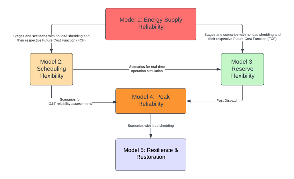 O framework SINAIS, projetado para estimar indicadores de confiabilidade, flexibilidade e resiliência de sistemas elétricos, baseia-se em um conjunto de cinco modelos de simulação distintos, cada um voltado para dimensões específicas de desempenho.
