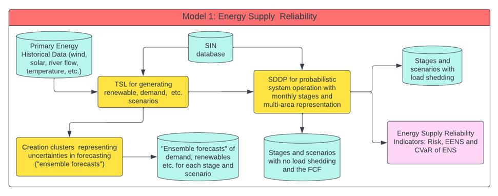 - O primeiro modelo avalia a segurança de suprimento de energia do sistema, estimando métricas de confiabilidade relacionadas ao atendimento da demanda.