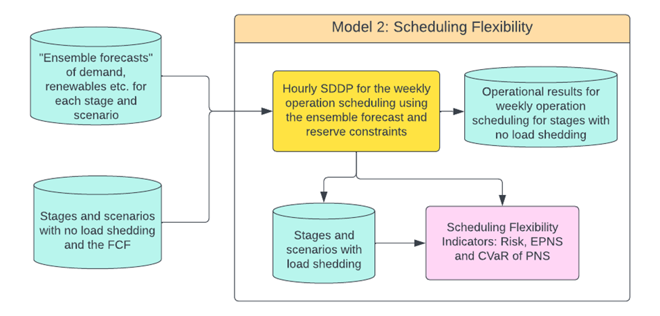 O segundo modelo, chamado flexibilidade de reserva, avalia a capacidade do sistema de redespachar geração em tempo real, utilizando reservas operativas para acomodar incertezas como:
