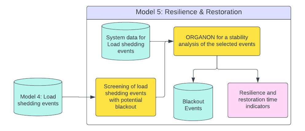 Por fim, o modelo 5 utiliza os resultados da simulação de confiabilidade em pico para identificar cenários em que ocorreram interrupções de carga.